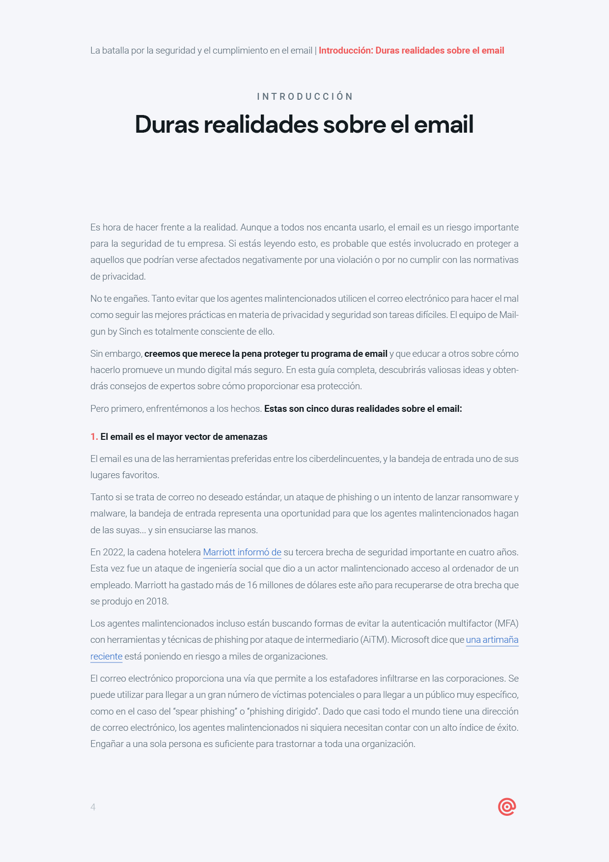 Necesitas trabajar junto con tus colaboradores tecnológicos para asegurarte de que mantienes el email y los datos personales seguros. Si no lo haces, pones a tus clientes, tus empleados, tu negocio y la reputación de tu marca en riesgo. Para ayudarte a comprender lo que está en juego y cómo mejorar la seguridad del email y el cumplimiento normativo en tu organización, nuestro equipo de expertos en Mailgun se han reunido para ofrecerte orientación.
