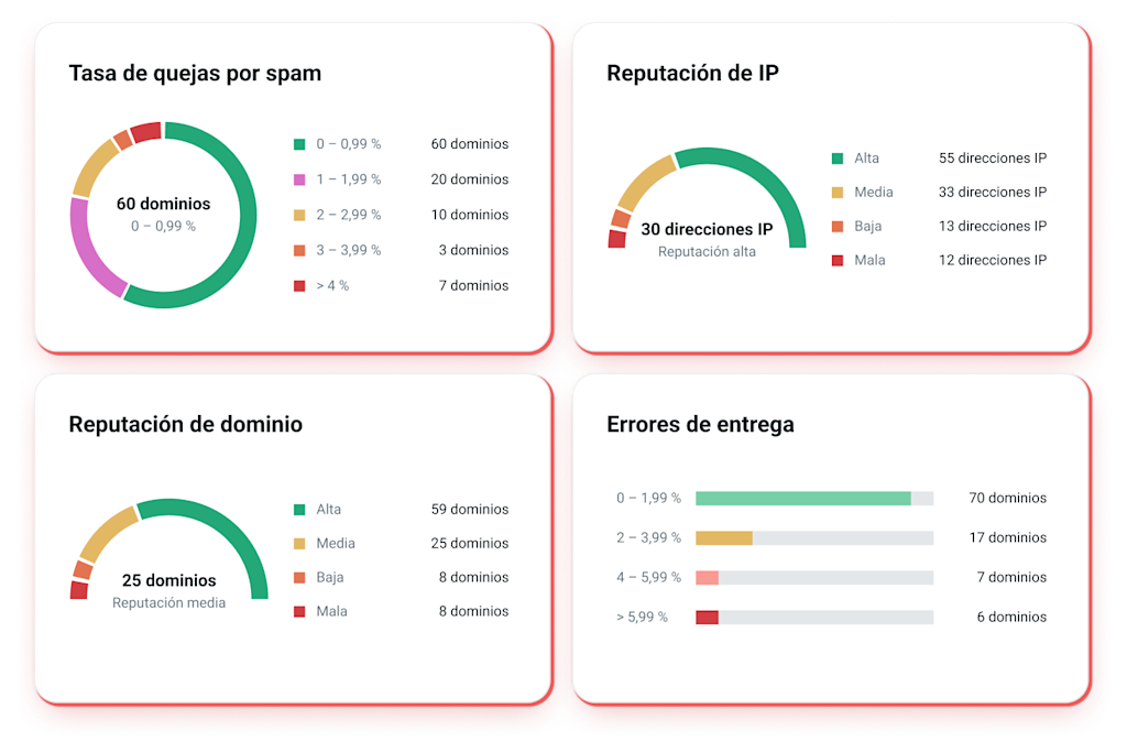 Nuestra puntuación de salud del email te proporciona una instantánea de tu entregabilidad general para facilitar la supervisión y la corrección de los problemas en función de las cinco señales de entregabilidad del email más críticas: rebotes, quejas, trampas de spam, bandejas de entrada llenas y fallos graves. Con estos factores visualizados en una sola vista, podrás identificar los problemas de envío en menos tiempo que nunca.