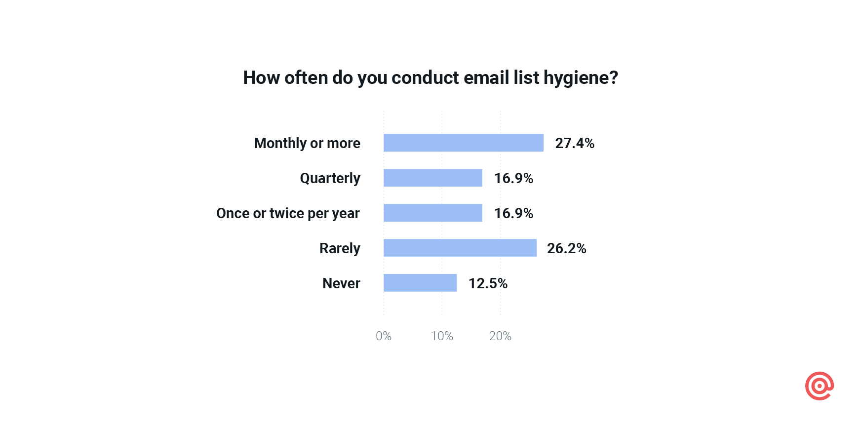 Our survey found just over 60% of senders conduct list hygiene on a regular basis. In fact, more than 28% do it every month. Unfortunately, a combined 39.2% of senders admit they rarely or never clean their lists.