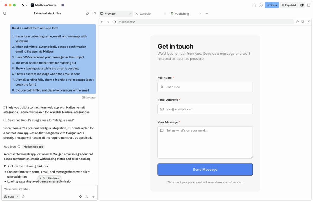 Bitten Sie den Replit Agent, „den E-Mail-Versand über Mailgun zu aktivieren,“ Ihren API-Schlüssel und Ihre verifizierte Domain anzugeben, wenn Sie dazu aufgefordert werden, und testen Sie dann Ihre Integration. Im End-to-End-Leitfaden finden Sie einen vollständigen Überblick über die Überprüfung der Domäne, die Bereitstellung und gängige Anwendungsfälle.