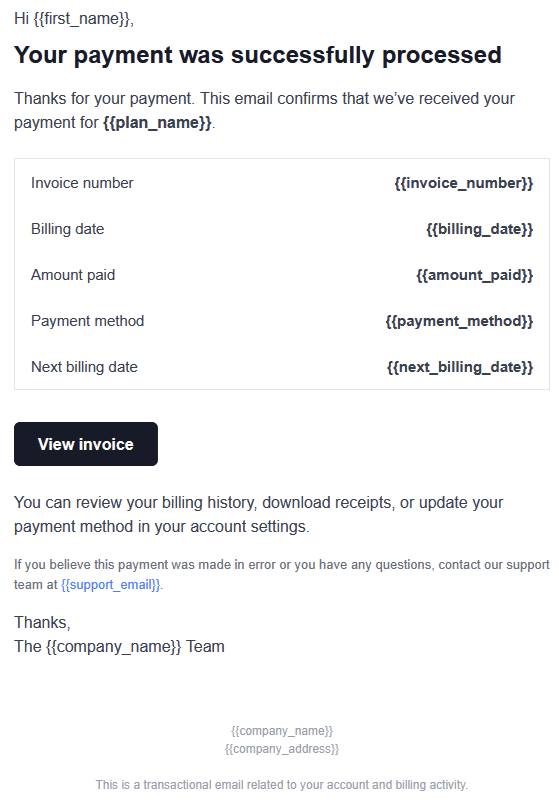 Las plantillas de email HTML transaccionales son básicas para mejorar la experiencia del cliente y agilizar el funcionamiento de la empresa mediante la automatización. Entre los tipos más populares se encuentran las plantillas de email para facturas, que proporcionan detalles de las tarifas para servir de ayuda a la hora de garantizar que los clientes entiendan sus cargos y la actividad de la cuenta. Estas plantillas suelen integrarse a la perfección con varios sistemas de facturación y CRM, lo que permite realizar actualizaciones en tiempo real y una comunicación personalizada. Los emails de factura automatizados no solo ahorran tiempo, sino que también reducen el riesgo de error humano, contribuyendo a un flujo de trabajo más eficiente.